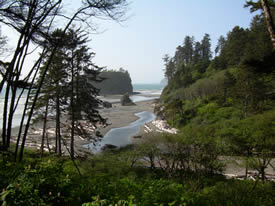 Ruby Beach is located on Highway 101, twenty seven miles south of the town of Forks. Like virtually all beaches on the northern coast, Ruby Beach has a tremendous amount of driftwood. It is notable for the number of sea stacks there. A sea stack is a geological landform isolated by erosion consisting of a steep and often vertical column or columns of rock in the sea near a coast. |