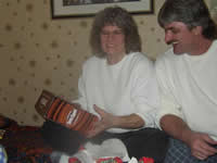 We decided ahead of time to have our Christmas in Vegas together so we made a makeshift Christmas Tree out of the lamp. We covered it with a towel and plastered bows all over it. Of course the gifts from Australia were the highlight of our Santa tree. Reg gave Bill and Becky some TimTams. A Tim Tam is a chocolate covered malted biscuit filled with chocolate cream filling - delicious. |